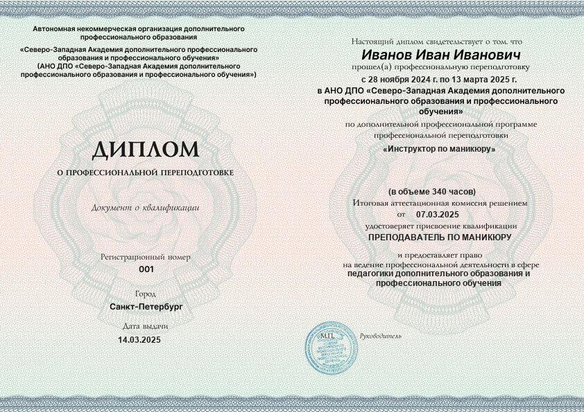 После прохождения итоговой аттестации вы получите квалификацию «Преподаватель по маникюру», которая будет подтверждать ваши компетенции. Это позволит вам работать в салонах, открыть свою студию, запустить авторские курсы или стать экспертом в образовательных проектах.