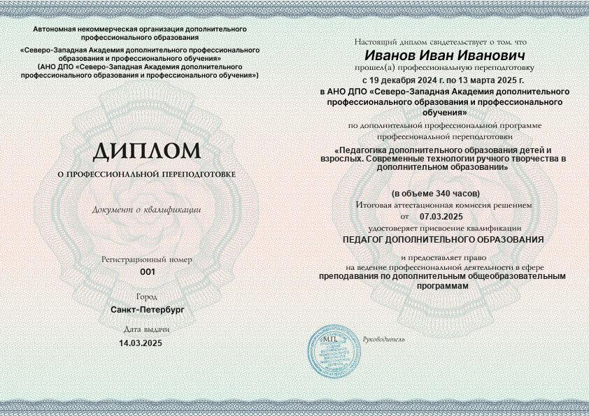 Курс обучения Педагогика дополнительного образования детей и взрослых. Современные технологии ручного творчества в дополнительном образовании (340ч)
