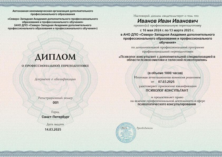 Каждый документ (диплом/удостоверение/свидетельство) соответствует п.2 ст.60 N-273 ФЗ, оформляется на русском языке, печатается на типографском бланке, защищённом от подделок. Ставится официальная печать образовательной организации. С образцами документов можно ознакомиться на сайте в разделе «Лицензия и документы».