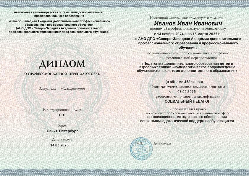 Каждый документ (диплом/удостоверение/свидетельство) соответствует п.2 ст.60 N-273 ФЗ, оформляется на русском языке, печатается на типографском бланке, защищённом от подделок. Ставится официальная печать образовательной организации. С образцами документов можно ознакомиться на сайте в разделе «Лицензия и документы».