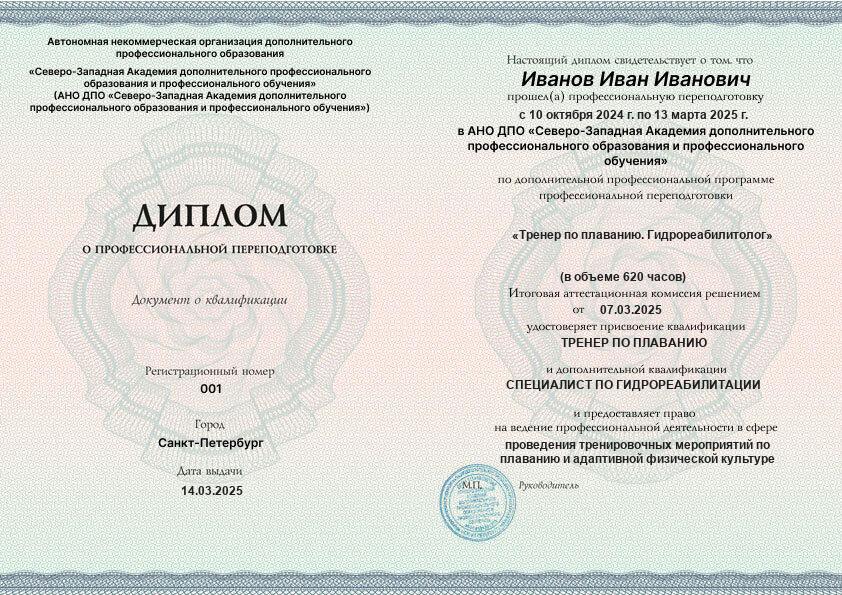 - 2 квалификации: Тренер по плаванию + Специалист по гидрореабилитации