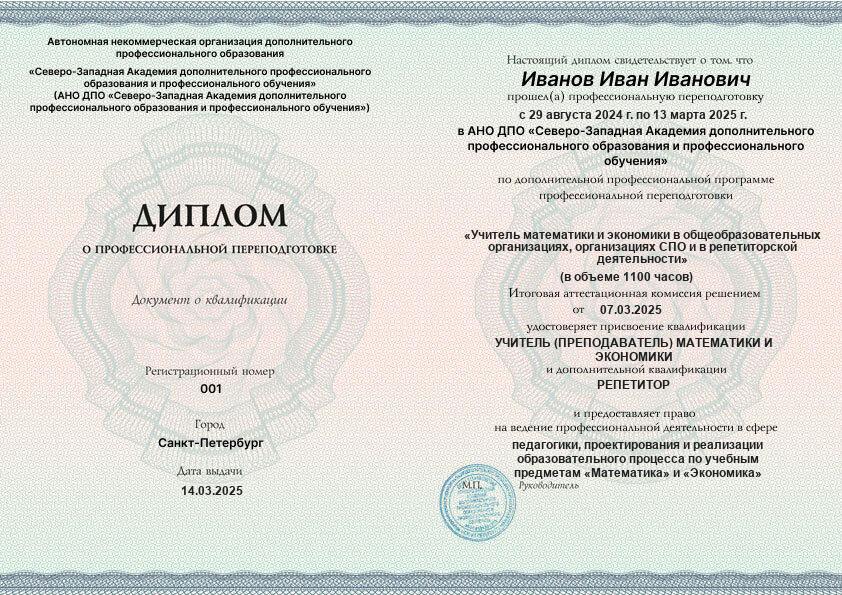 - 2 квалификации: Учитель (преподаватель) математики и экономики + Репетитор